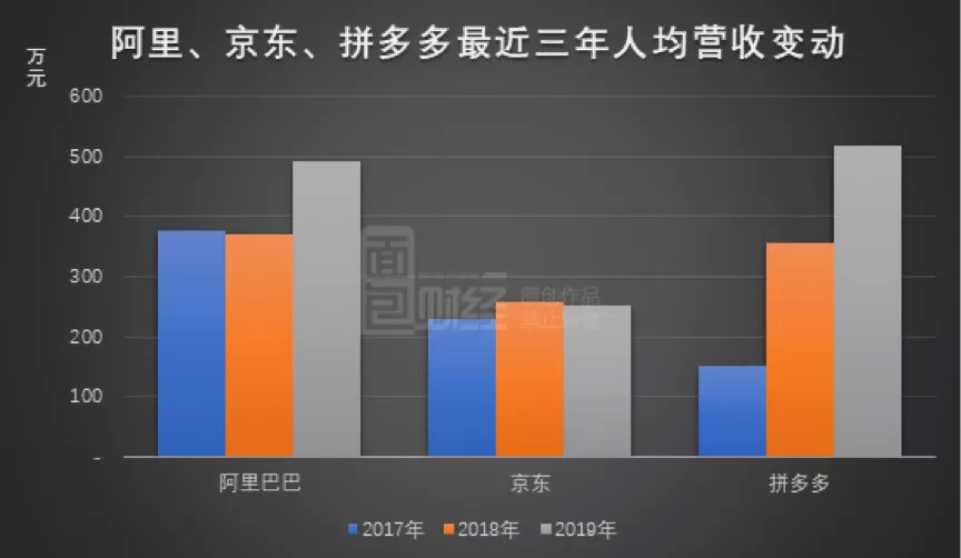 这个人均绩效还是建立在拼多多平台低货币化率的基础上。如果以人均GMV来衡量,2019年拼多多为17271.79万元,京东则只有915.73万元。阿里的数据缺失,但考虑到阿里平台的货币化率远高于拼多多,而拼多多的人均营收又明显高于阿里,因此拼多多在人均GMV上大幅领先,并无疑问。