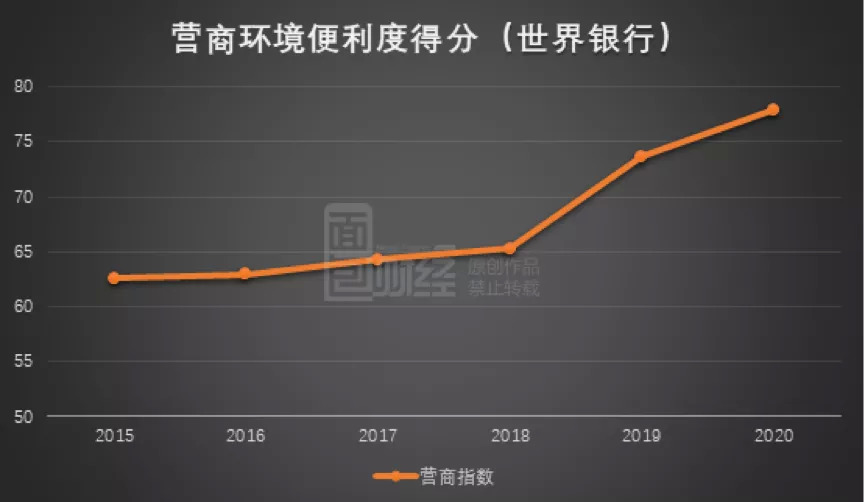 世界银行每年编制一份《全球营商环境报告》对全球各大经济体的营商环境进行量化评估和排名。过去几年,中国在全球的营商环境排名持续提升,从2013年报告的第99名提升到2020年报告的第31名(对应评价年份是2019年)。