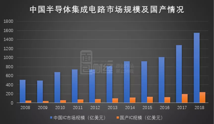 从需求端分析,随着经济的不断发展,中国已成为了全球最大的电子产品生产及消费市场,衍生出了巨大的半导体器件(芯片)需求。根据IC Insights统计,从2013年到2018年仅中国半导体集成电路市场规模就从820亿美元扩大至1550亿美元,年均复合增长率约为13.58%。从供给端分析,对比巨大的国内市场需求,国产半导体集成电路市场规模较小,2018年自给率仅为约15%。