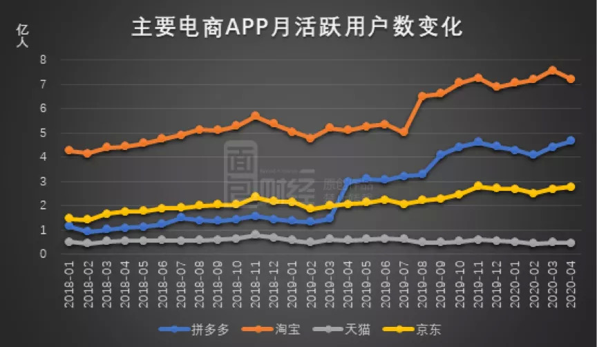 行业数据显示,2020年4月,拼多多App的月活跃用户数达到4.65亿,远超京东的2.76亿。