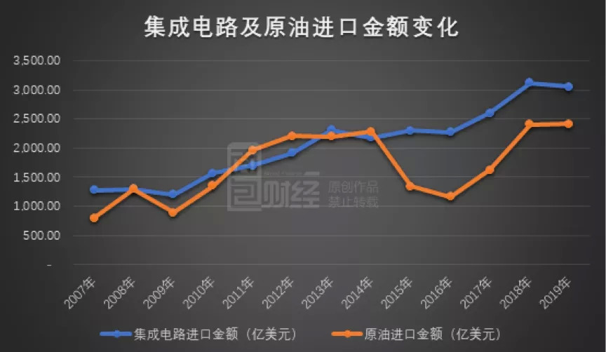 自给能力不足,不得不耗费大量外汇储备进口芯片。海关总署数据显示,2014年之后,中国集成电路进口金额持续超过原油进口金额。2019年集成电路进口金额有所下降,进口额仍达到3055亿美元,远超原油的2413亿美元。