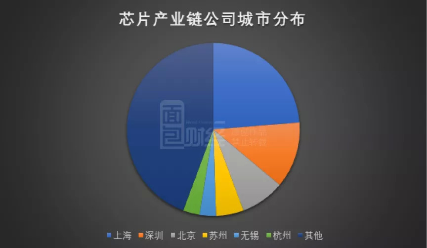 面包财经梳理了97家在五大交易所上市的内地芯片产业链相关公司,注册地分布在42个城市;总部位于长三角的有49家,其中上海23家(占比23.71%);位于粤港澳大湾区(内地九城)的有19家,其中深圳12家(占比12.37%)。