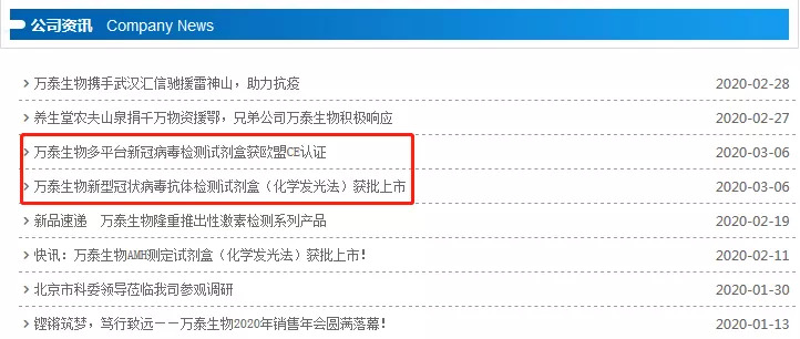 在万泰生物的官网上有这么几条资讯。稍微翻译一下标红的部位:我们的新型冠状病毒抗体检测试剂盒批准上市了,而且有欧盟CE认证,出口无忧。