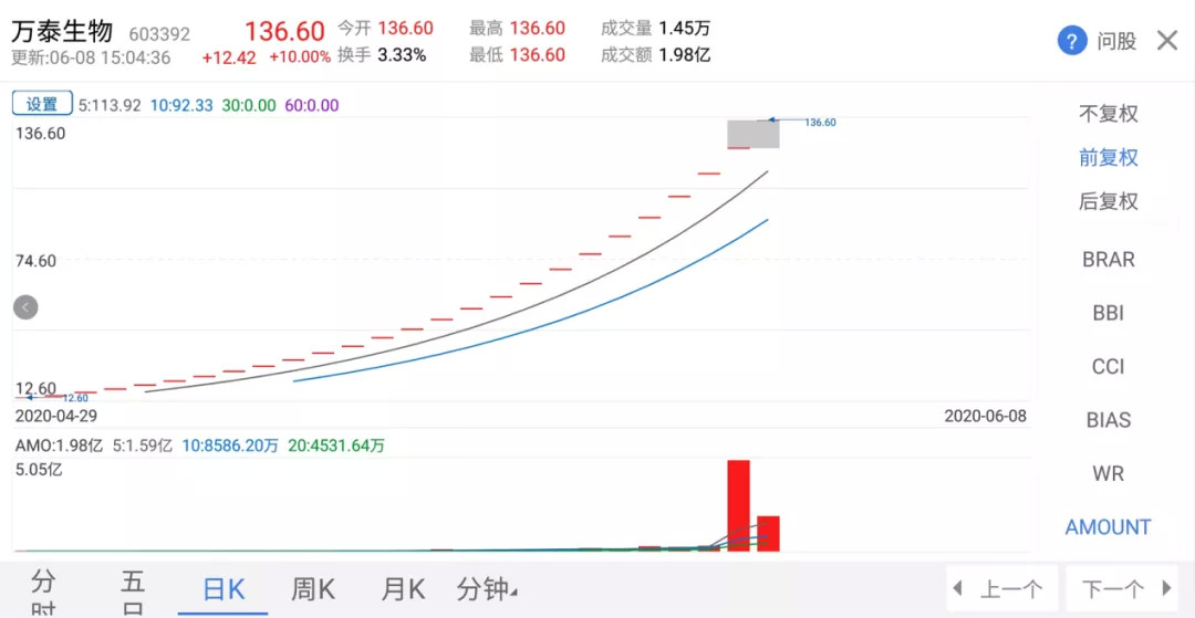 结果到了今天,万泰生物已经连续拿下了26个涨停板,股价从8.75块涨到了136.6块,单签净赚12.8万。而我们可怜的萌新只赚了不到一个零头。