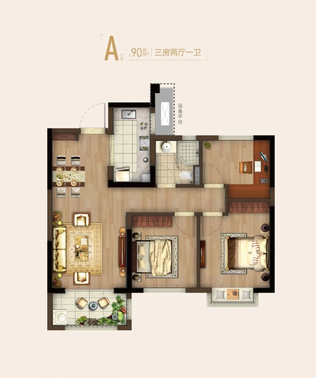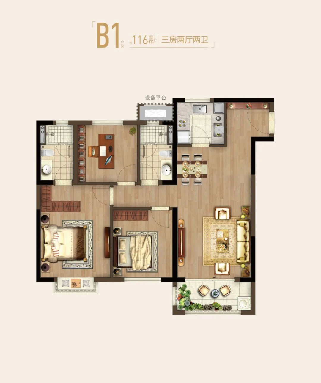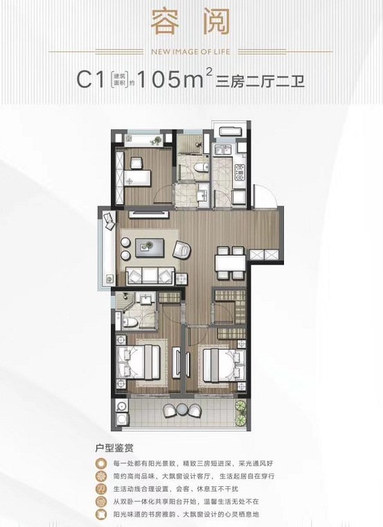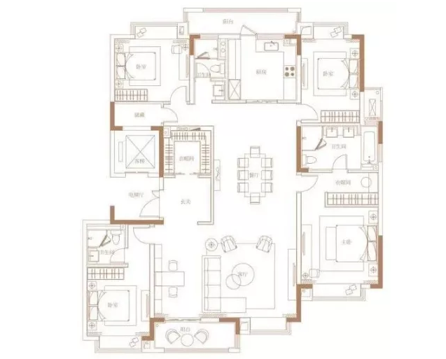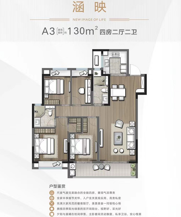 其中最大户型215㎡,四房两厅三卫,南北双阳台,大横厅设计,四个房间均带飘窗,且互不干扰。