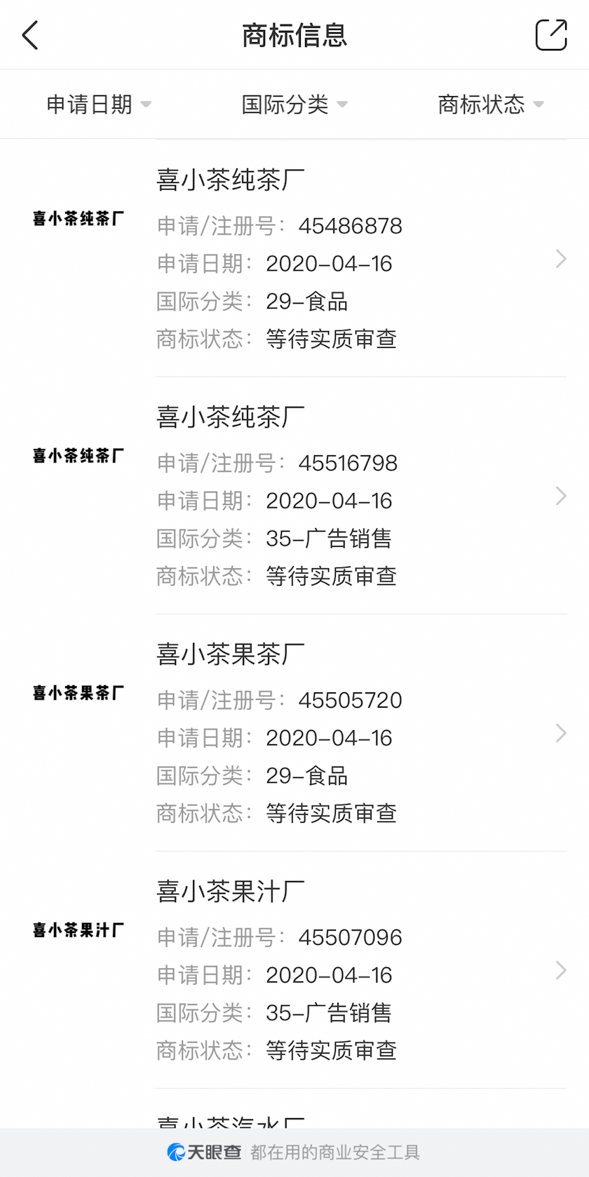 而在更早的4月,喜茶还曾密集注册过如“喜小茶纯茶厂”“喜小茶果茶厂”“喜小茶汽水厂”等商标,这些商标目前仍未出现在喜小茶所销售的产品上,也没有开设门店。