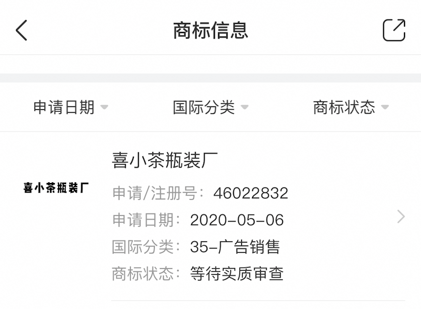 而界面新闻通过天眼查发现,在5月6日,喜茶母公司、深圳美西西餐饮管理有限公司已经申请注册了一个名为“喜小茶瓶装厂”的商标。这极有可能便是喜小茶未来预包装产品的名称。