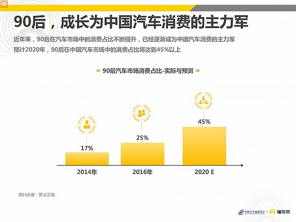 中国汽车流通协会发布的《2019中国汽车消费者洞察报告》里指出,2014年90后汽车消费市场占比17%,2016年提升至25%,2019年上半年为42.4%。90后等年轻用户更喜欢进口车,对豪华品牌也异常关注,对外观内饰的关注度远高于其他年龄段。