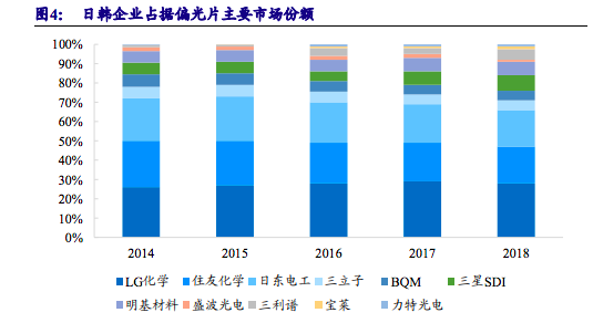 此外,日本三立化学、韩国三星SDI、台湾奇美也左右着全球偏光片市场。