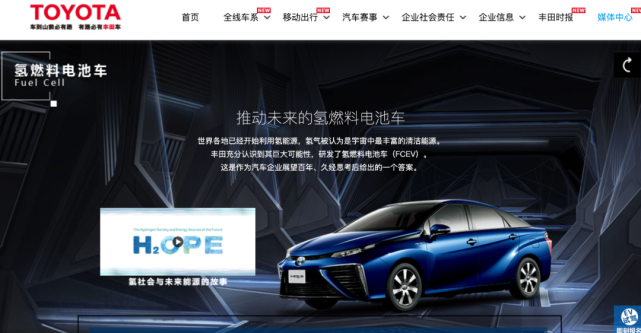 丰田中国的官网上用了一整个版面来介绍氢燃料电池车以及相关技术,并且页面的主题为推动未来的氢燃料电池车。