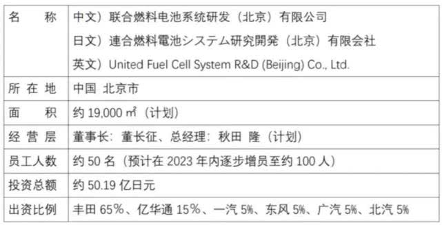 新公司由各公司共同出资,总投资额50.19亿日元,预计于2020年内在北京正式成立。主要业务为在中国开展商用车燃料电池系统研发工作。