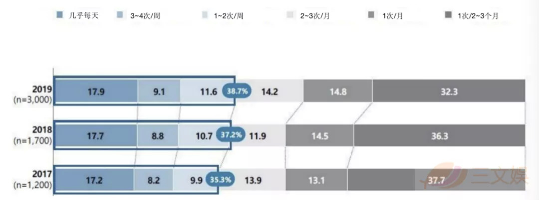 1个月使用过1次,2~3次的占比分别为14.8%和14.2%。