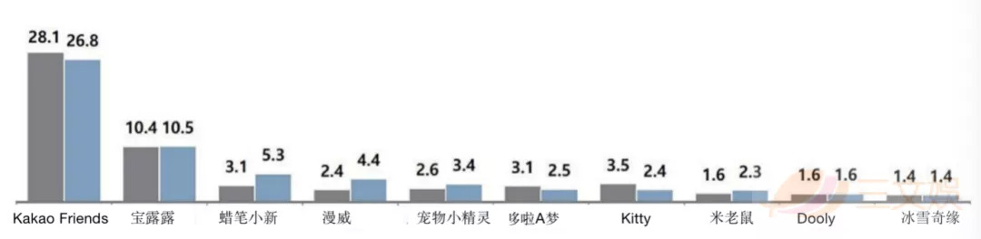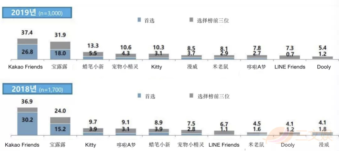 而在“我最喜爱的角色”调查中,Kakao Friends以26.8%(1+2+3为准)的得票率稳居榜首,其次是企鹅宝露露(10.5%)、蜡笔小新(5.3)、漫威(4.4%)。