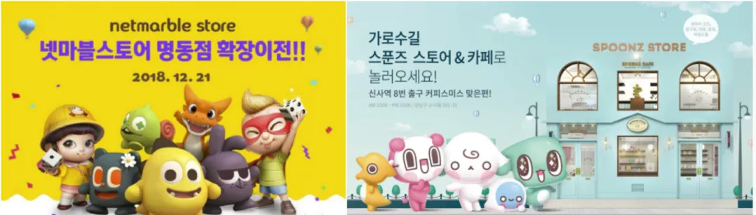 到了2018年,Netmarble Store销售300多种产品。NCSoft旗下的Spoonz为了打破其主要以男性为主要消费用户的局面,吸引更多的千禧一代及女性用户,2019年第一家旗舰店正式开业。此外还进行了与7-11便利店、农心食品、乐天影业等多领域的合作。