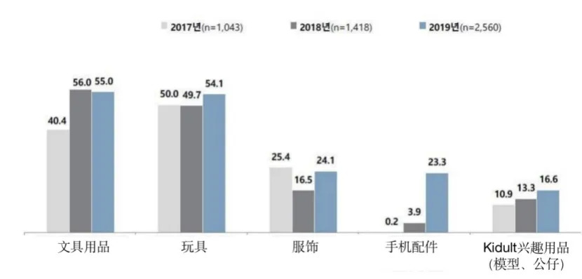 在“最近一年购买的主要角色周边产品是什么”的调查中,55%的回答是文具,其次是玩具(54.1%)、服饰(24.1%)、手机配件(23.3%)、模型/公仔(16.6%)。从表中可以看出,手机配件的购买率增长速度最快。
