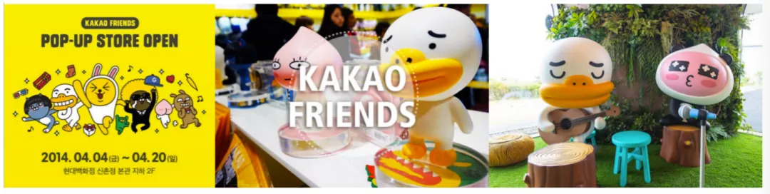 除了线上销售,快闪店的举办也为角色产业带来了相当可观的收益。2014年,Kakao Friends在Sinchon现代百货开设了快闪店,开业仅5天就实现了2亿韩元(≈116.84万元)的销售额。