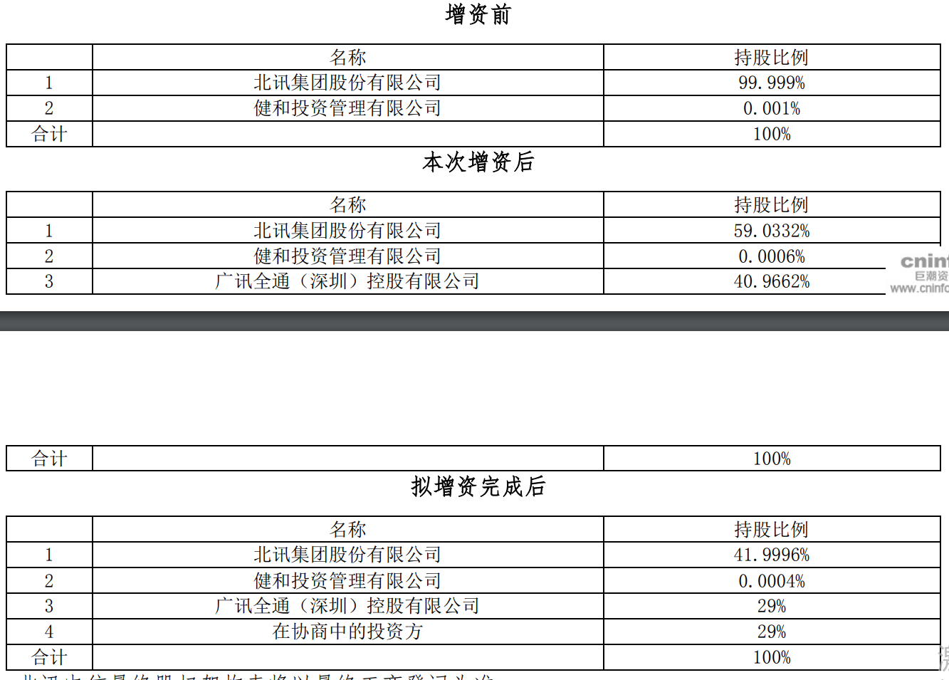 增资前 ,*ST北讯持股高达99.99%,此次增资后将降为59.03%,后续再加上其他协商中的投资方进入的话,持股比例将进一步下降为42%左右。不过,这一议案获得同意票5票,反对票1票,反对者为副董事长王天宇。