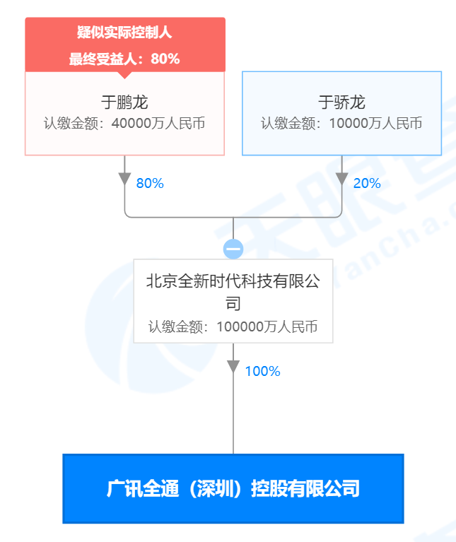 天眼查显示,广讯全通由北京全新时代科技有限公司100%控制,北京全新时代科技有限公司有两位自然人股东,分别为于鹏龙(持股80%)和于骄龙(持股20%)。广讯全通成立于2019年12月12日,注册资本10亿元。关注函中显示,该公司,尚未实缴注资。