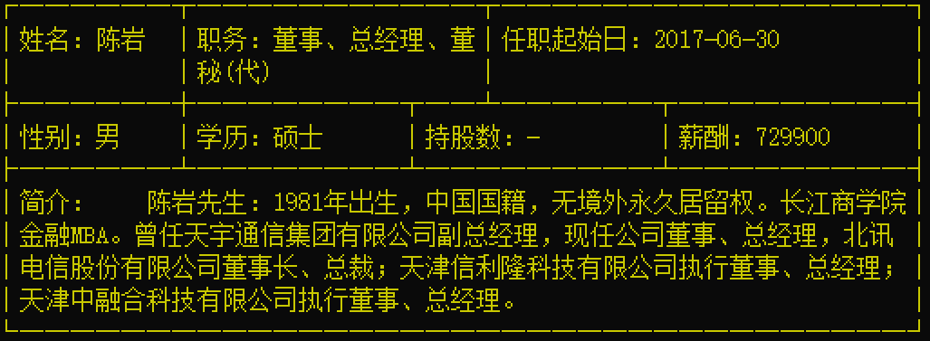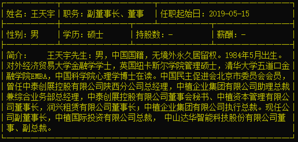 说起来,投出反对票的王天宇,来头也不简单。据公开信息,该人士是2019年3月份由董事会提名,补选进入的董事会,自2019年5月15日任职副董事长,系中国民主促进会北京市委员会会员,曾任中泰创展控股有限公司陕西分公司总经理,中植企业集团有限公司助理总裁兼综合业务部总经理,中泰创展控股有限公司董事会秘书、中植资本管理有限公司董事长,润兴租赁有限公司董事长;中植企业集团有限公司执行总裁。其现任*ST北讯副董事长,中植国际投资有限公司总裁, 中山达华智能科技股份有限公司董事、副总裁。