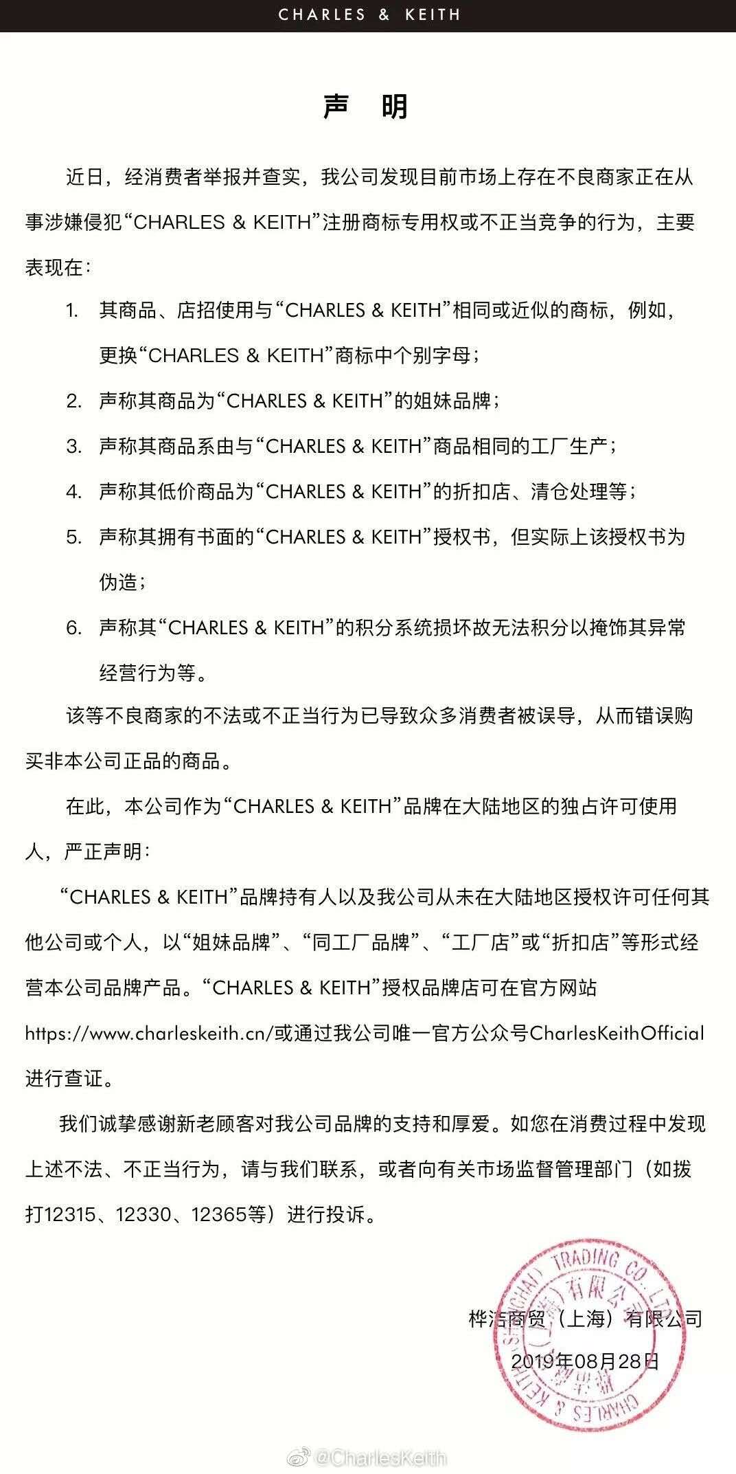 2019年8月28日,小CK的上海子公司桦洁商贸有限公司发布声明称,已发现这一不正当竞争行为,并严正声明自己是Charles & Keith品牌在大陆地区独占许可使用人。