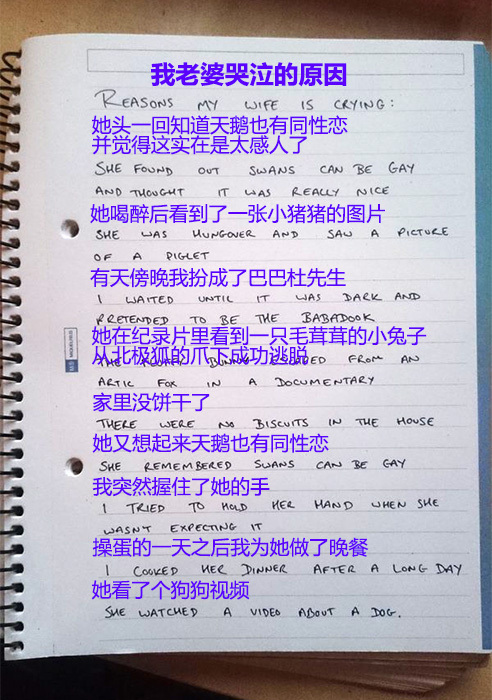 歪国社交网络上有一种常见的笑话类型叫做Meta-joke,指那些关于笑话的笑话,大意就是我们平时所说的“梗”,从拉博夫的“Just Do It”到Netflix and Chill再到最近大热的特拉沃尔塔,这种不知道语境就看不懂的笑话总是备受网友追捧。而今天的新梗则起源于这样一张图:一位网友的老婆特别容易感动,一感动就哭,他甚至专门列了张单子,总结了各种使他老婆哭泣的原因。