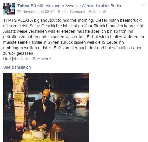 图中的男子名叫Alex,是一名在德国避难的叙利亚难民,每周六他都会在柏林街头为无家可归者发放免费食物。