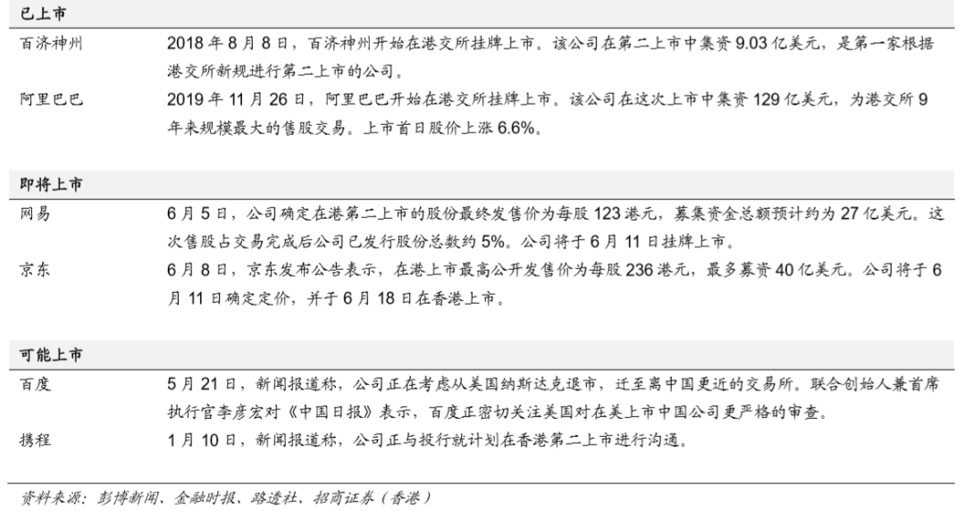 按照目前的公告,6月11日、6月18日,网易、京东将分别在港股市场二次上市;而与此同时,媒体报道称百度、携程也正在考虑回归香港。