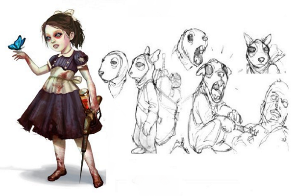 小孩的形象本该是天真无邪的,如果设计成一副长残了的样子可真是让人心情复杂。在上图的手稿中,我们可以看到《生化奇兵》里的小妹妹最早被设计成了类似花栗鼠或松鼠一样的奇怪生物。