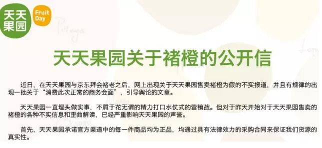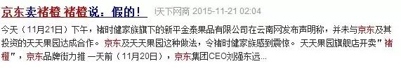 11月21日,褚时健家族旗下“新平金泰果品公司”发表正式声明piapia打脸。声明称,“此次拜会属于公司间正常参观交流,京东及其投资的天天果园目前暂未和金泰果品达成合作”,并强调褚橙现有网络销售渠道只有天猫、淘宝与本来生活。