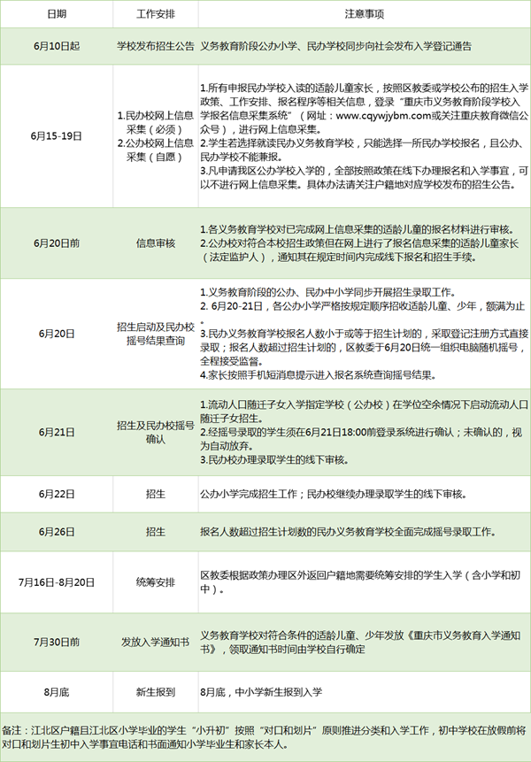 江北区义务教育阶段学校2020年招生工作日程安排表