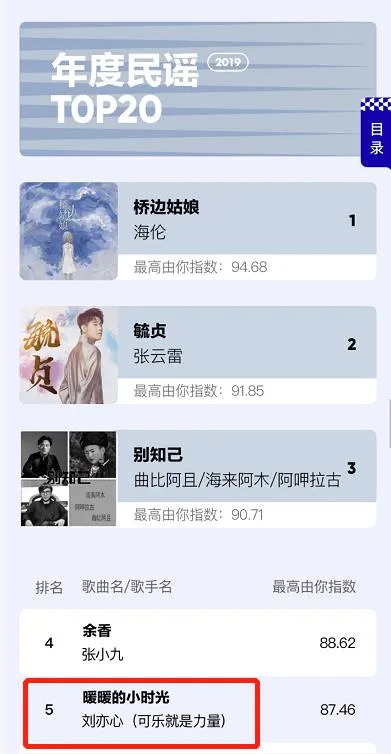 而近年借助短视频渠道走红的为数不多的所谓民谣歌曲,质量也层次不齐,演唱者更是面容模糊。去年年度民谣TOP20里,排名前三的是《桥边姑娘》《毓贞》《别知己》,这大概也不会得到主流民谣听众的认同,但这些首贴着民谣标签的歌又确实在大平台拿到了很好的数据。