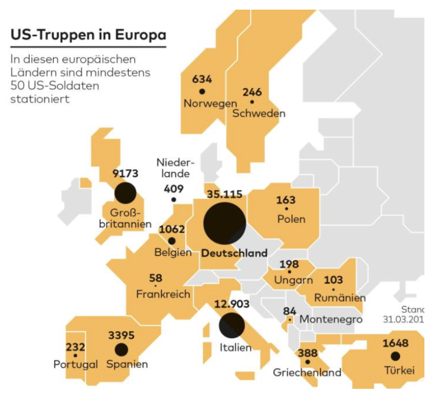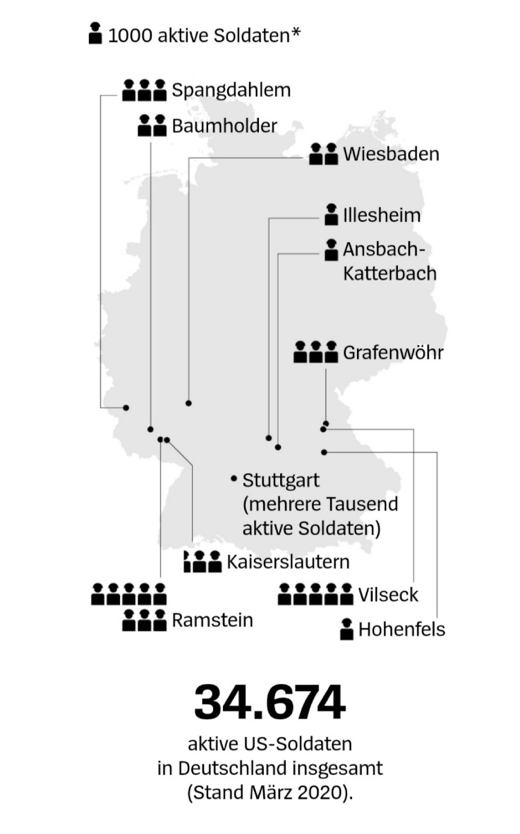 目前,美国在德国的驻军规模达3.5万人,德国也是仅次于日本的美国第二大海外驻军国。其中,莱茵兰的拉姆施泰恩是美国本土之外最大的空军基地,该基地的主要职能并非保护欧洲盟国,而是美军运送军备物资至叙利亚、伊拉克、阿富汗等冲突地区的重要枢纽。德国南部的斯图加特也是美国驻欧与驻非部队的总指挥部。