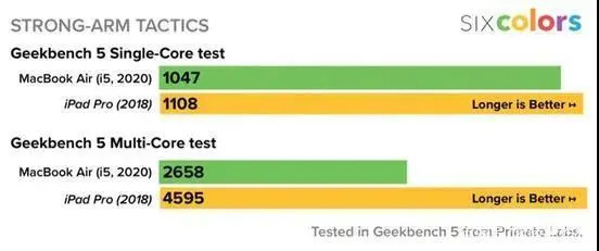 目前,GeekBench跑分数据库中已经有了新款iPad Pro和MacBook Air 2020的跑分成绩。相较于前代,MacBook Air 2020单核性能提高了32%,多核性能提高了63%。但这一成绩还是比不过搭载12Z芯片的新款iPad Pro。