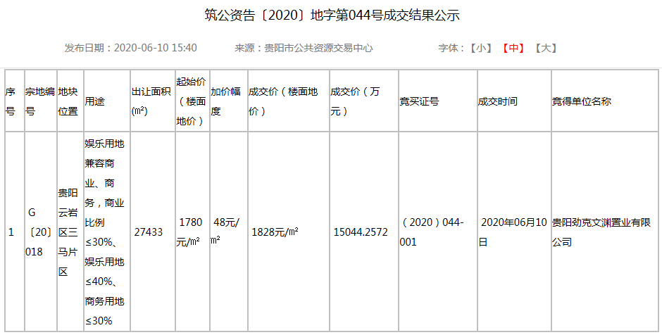 6月10日,据贵阳市公共资源交易中心公示,位于贵阳云岩区三马片区的G〔20〕018号娱乐兼容商业、商务用地成功出让,被贵阳劲克文渊置业有限公司以总价1.5亿元成功竞得。成交楼面地价1828元/㎡,地块出让面积2.74万方。