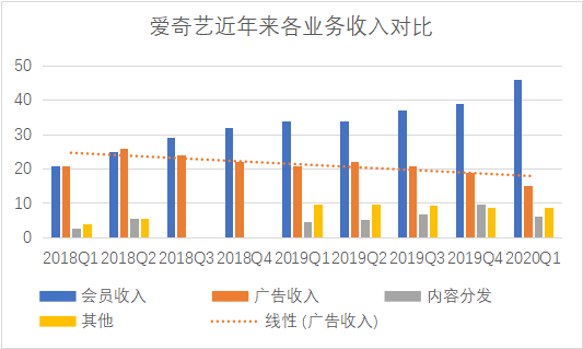 爱奇艺于2018年3月29日在美国纳斯达克上市,上市后的第一季度,其广告收入达到了26亿元,这应该是迄今为止它的历史最高纪录。随后,它的广告收入就一路向下,与会员收入的一路上涨形成了此消彼长的有趣现象。