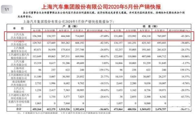 然而,根据上汽集团发布的最新数据显示,2020年5月份,上汽大众销量为131,000万辆,相比2019年同期的153,992辆,下滑14.9%;1-5月份上汽大众累计销量434,110辆,同比下滑43.26%。