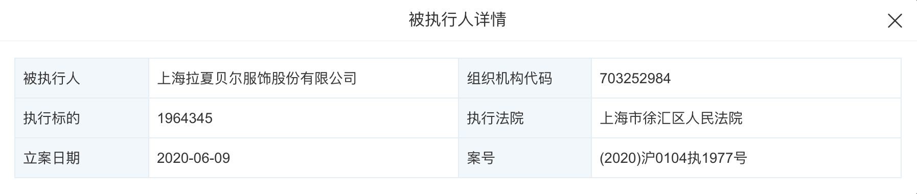 上海拉夏贝尔服饰股份有限公司被列为被执行人,执行标的近200万元