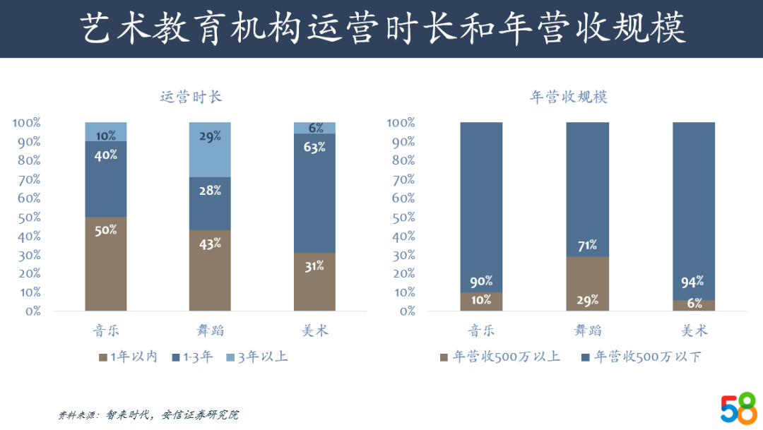 · 就集中度而言,线下的教育机构虽然发展时间长,但依然较为分散,仅出现少数规模化的教育机构。我国艺术教育机构中,仅有不到20%的机构可以做到年营收破500万元。并且运营时间多半是3年以下,且还有50%为1年以下