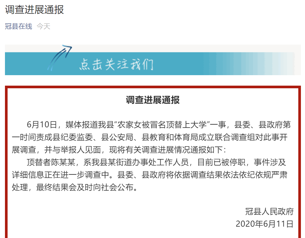 冠县人民政府官方微信号“冠县在线”6月11日通报,6月10日,媒体报道我县“农家女被冒名顶替上大学”一事,县委、县政府第一时间责成县纪委监委、县公安局、县教育和体育局成立联合调查组对此事开展调查,并与举报人见面,现将有关调查进展情况通报如下: