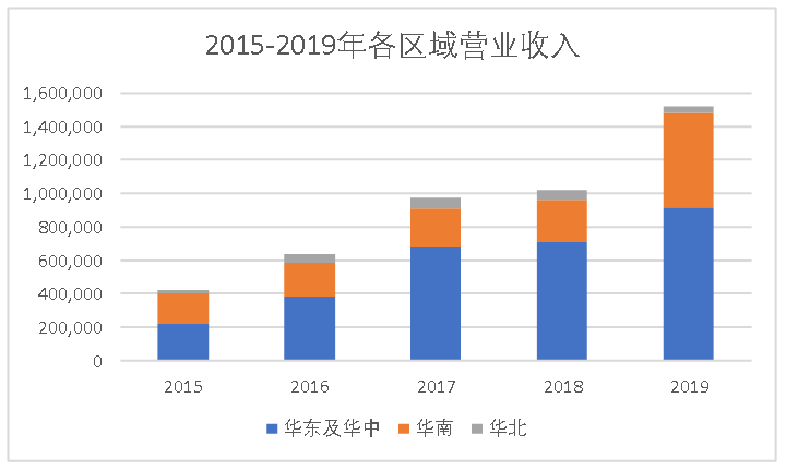 2015-2019年,中奥到家华东及华中营收分别为2.21亿元、3.81亿元、6.76亿元、7.06亿元、9.13亿元,占比分别为52.69%、59.92%、69.18%、69.04%、60.11%;华南区域营收分别为1.79亿元、2.01亿元、2.35亿元、2.53亿元、5.68亿元,占比分别为42.71%、31.68%、24.09%、24.70%、37.41%;华北区域营收从2017年开始逐步下降,三年间营收跌幅达42.69%,营收占比亦从2016年最高点8.40%下降至2019年的2.49%。不难推测,中奥到家基本围绕华东及华中、华南两大核心区域发展,一方面逐步聚焦成熟区域,另一方面退出营收、利润贡献较小的区域。