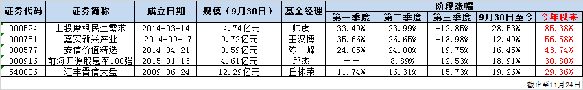 汇丰晋信大盘(540006)今年以来的涨幅在29.36%,不到三成。之所以也将其列入表中,是由于从今年以来收益率波动来看,该基金与大盘相比更平稳,且在三季度中有较好的抗跌表现。该基金总体来说仍坚持蓝筹优质公司策略,因此上半年上涨幅度不如大盘。但随着后半年行情急转,该基金顺势调整,中后期更是减持了部分三季度表现突出的银行、地产等行业的龙头公司,增持了基本面良好、估值已大幅提升的成长板块龙头公司,包括传媒、电子、计算机等行业的龙头公司,以及下跌之后估值更具有吸引力券商、化工、交运等低估值板块的优质公司。