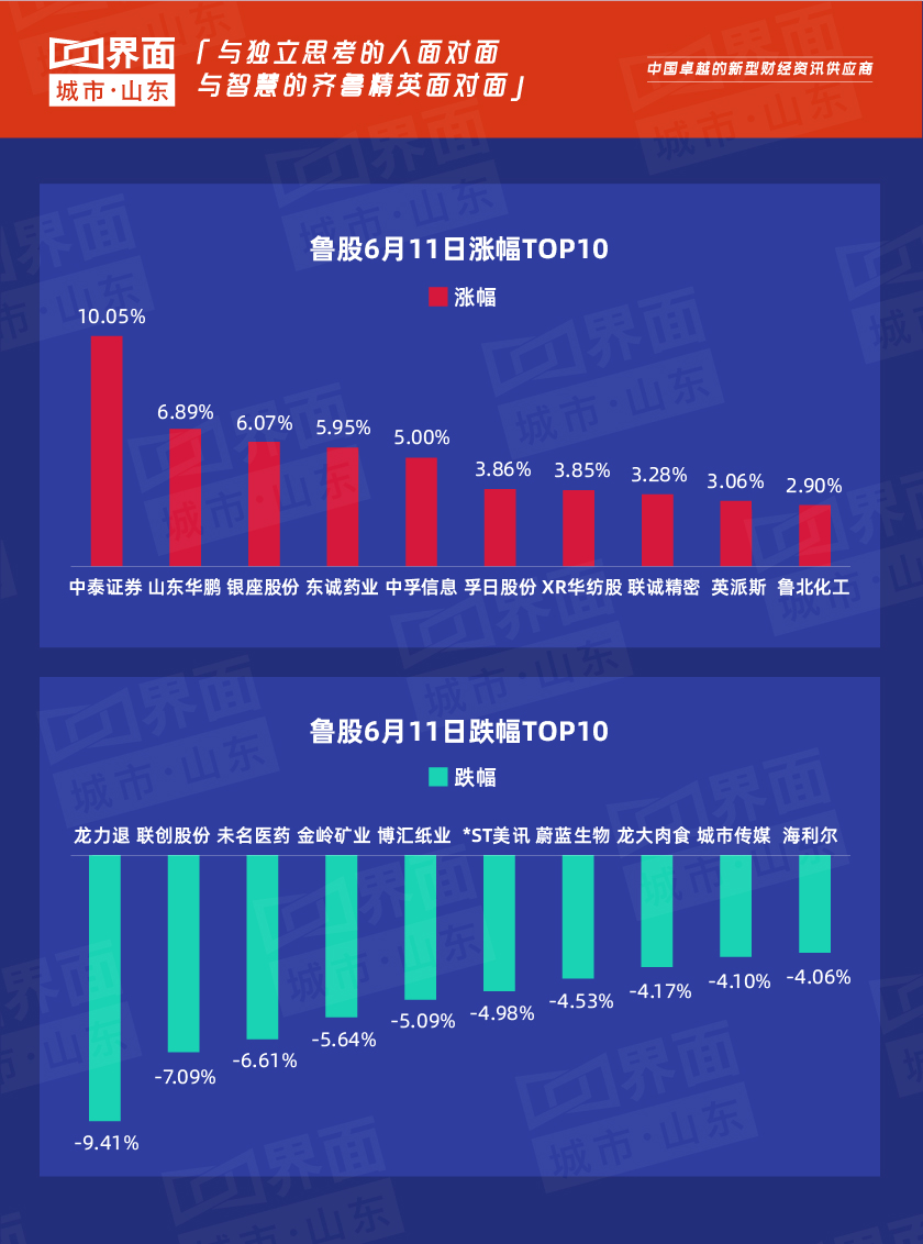 6月11日,山东省内沪深股票有71只个股上涨,135只下跌,6只与上一个交易日收盘价持平;