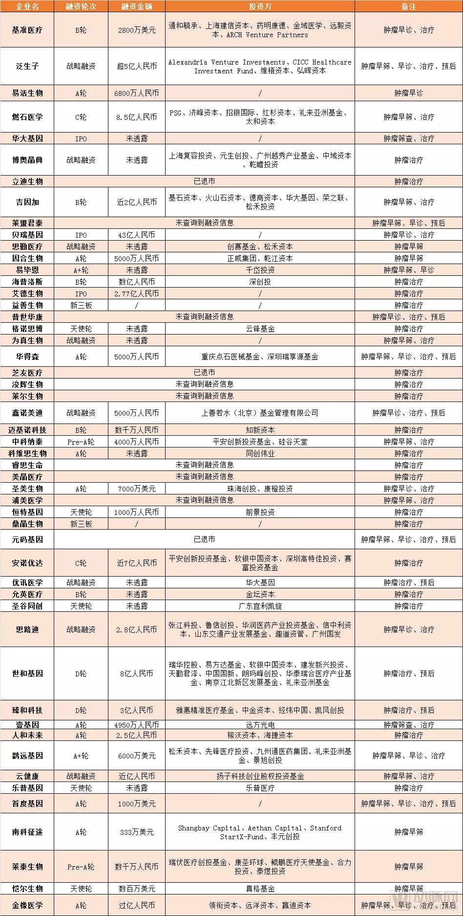 动脉网根据公开资料对50余家液体活检企业进行了整理(不完全整理,主要统计处于产业链中下游的液体活检企业),信息维度包括企业融资情况,产品/技术覆盖的肿瘤诊疗周期。