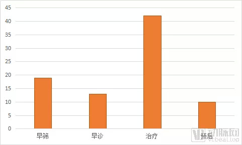 动脉网通过公开报道、官网等途径搜集了各家液体活检企业在肿瘤诊疗市场的产品布局,从各家企业的产品/技术覆盖的肿瘤诊疗周期来看,大部分液体活检企业都聚焦在肿瘤治疗环节,数量高达43家,反映出目前肿瘤治疗市场的发展较为成熟。
