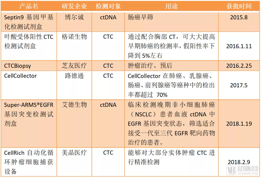 动脉网对获得CFDA批准的国产液体活检产品进行了不完整统计(主要统计处于产业链中游的液体活检产品)。从表中可以看出,获批的液体活检产品的检测对象主要集中在CTC和ctDNA,动脉网尚未统计到有以外泌体为检测对象的液体活检产品获批。近几年,关注外泌体的研究逐渐火热,其在肿瘤诊疗方面的应用潜力逐步被挖掘,可以预见以外泌体为检测对象的液体活检产品有望在近些年获批。