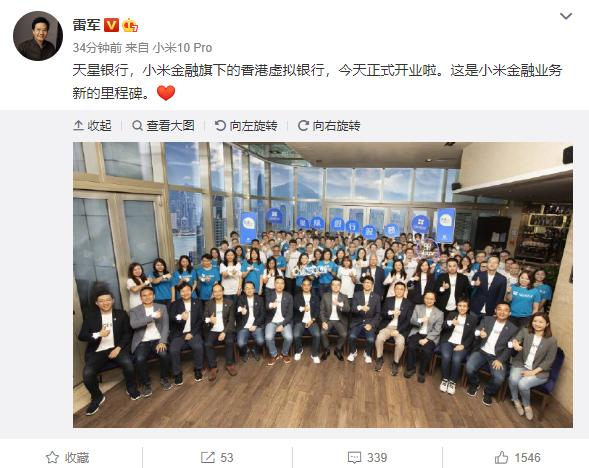 天星银行董事长、小米董事长兼CEO雷军在社交平台上表示:“这是小米金融业务新的里程碑。”