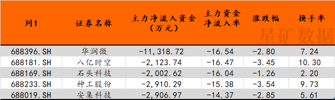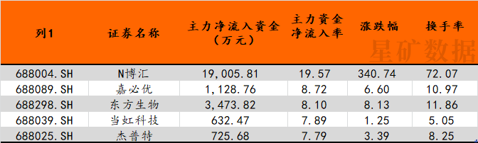 《科创板日报》12日讯,科创板日报•星矿数据统计显示,今日主力资金净流入的科创板个股共有33只,N博汇主力资金净流入19005.81万元,主力资金净流入率居首;嘉必优、东方生物紧随其后。主力资金净流出的科创板个股共77只,华润微流出率最高,共流出11318.72万元,其次是八亿时空、石头科技。