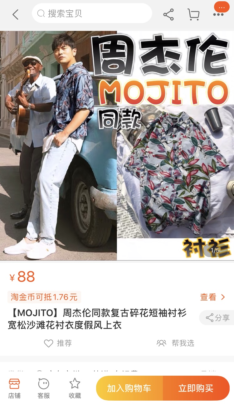 一些敏锐的淘宝商人已经嗅到了商机。界面时尚记者在淘宝看到,有商家已经卖起了“周杰伦mojito同款”复古短袖花式衬衫,而“vintage复古衬衫”、“小碎花男士衬衫”、“古巴领衬衫”等也频繁的出现在推荐搜素名单上。