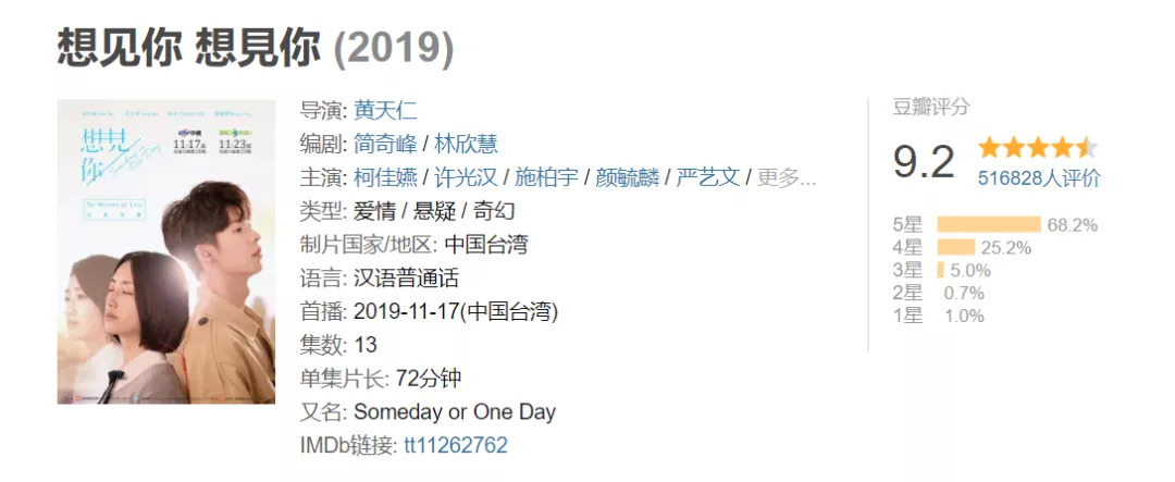 不少人对于许光汉的认知来源于2019年底的一部热播台剧《想见你》。作为近年来少有的高口碑之作,《想见你》的豆瓣分数高达9.2分,而超51万的打分人数,也侧面印证了该剧的爆款属性。
