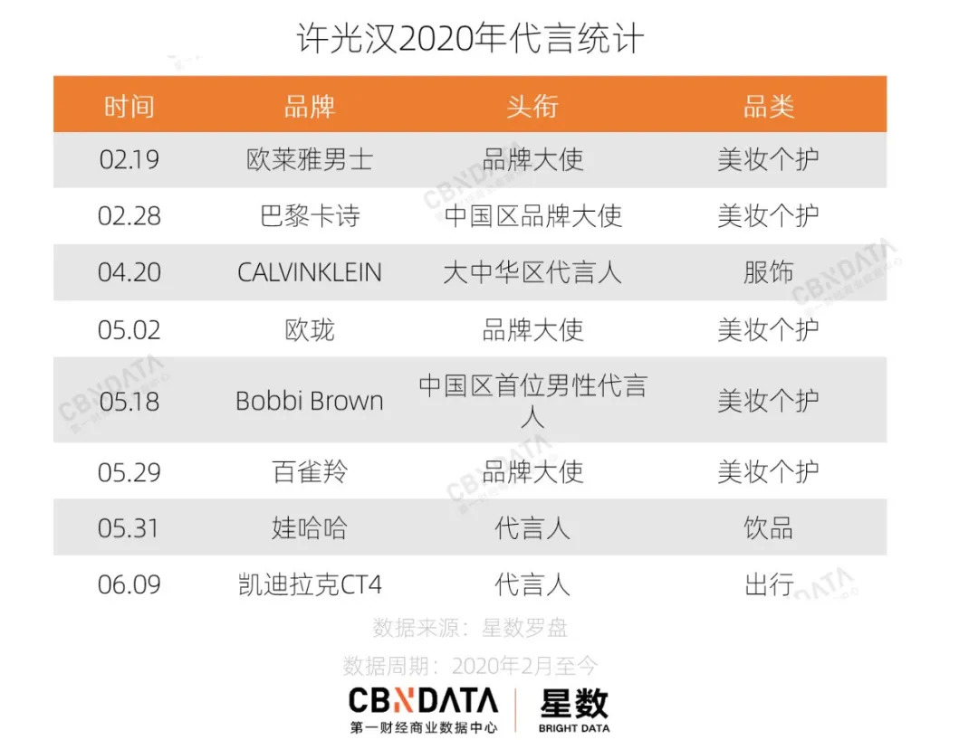 从品类和头衔来看,许光汉的代言资源格外亮眼。5个美妆个护代言中不乏法国欧珑、BobbiBrown等中高端品牌。